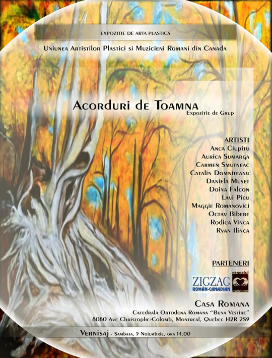 Expozitia Acorduri de Toamna reuneste simfonia culorilor transpusa in lucrarile a 12 dintre talentatii creatori din comunitate, fondatoarea Uniunii Artistilor Plastici si Muzicieni Români din Canada, pictorita Rodica Vinca spunind ca scopul infiintarii organizatiei este de a realiza proiecte care sa le puna si mai mult in valoare arta acestora. “Am 22 de ani de Canada, din care 9 ani am locuit in Vancouver. In toata aceasta perioada nu am gasit nici acolo si nici la Montreal, unde m-am stabilit ulterior, o reprezentare reala a artistilor români. De aceea am hotarit sa infiintez eu aceasta Uniune a Artistilor Plastici si Muzicieni Români din Canada. Comunitatea româna din Canada are artisti de marca, acestia au muncit de-a lungul anilor pina au ajuns la performanta de astazi, la recunoastere pe plan national si international. Ani lungi de munca si cautari! Si am considerat ca trebuie sa fie reprezentati de o organizatie care sa aiba in vedere promovarea lor, recunoasterea valorii lor si, de asemenea, organizarea de diferite proiecte artistice care sa ii puna in valoare. UAPMRCa este organizatia noastra cu personalitate juridica si ii invitam pe artistii si muzicienii români sa faca parte din ea si sa participe la activitatile noastre!”.