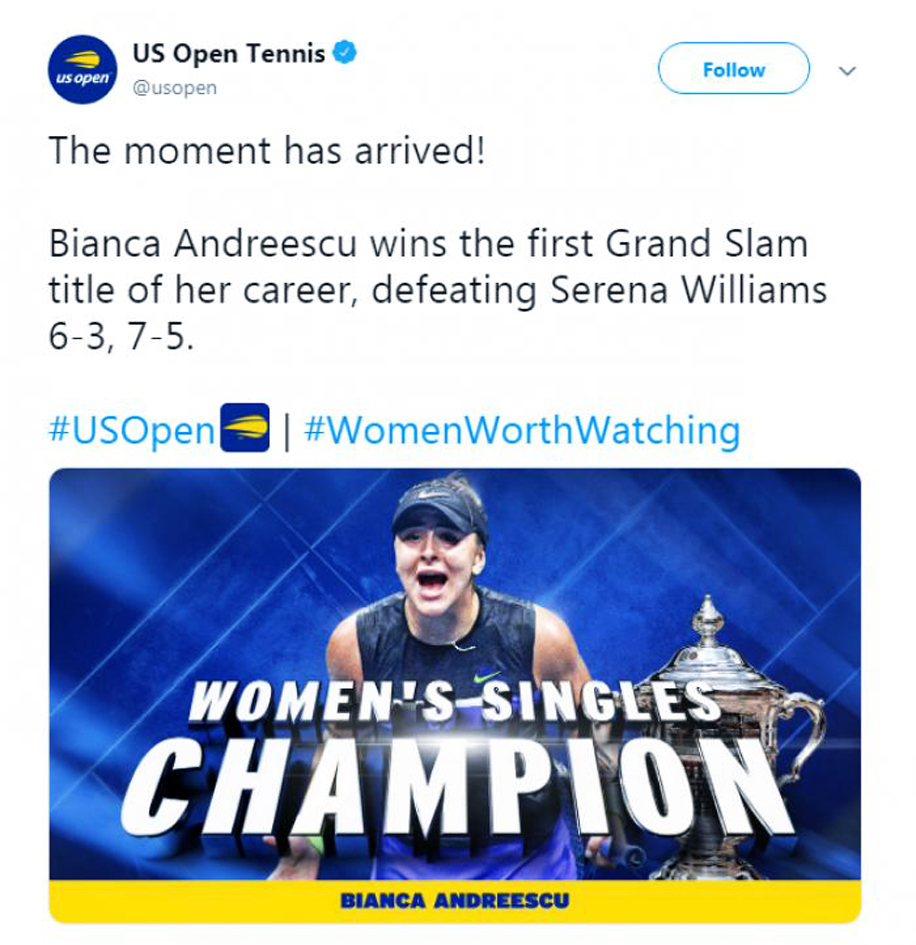 Bianca Andreescu: “E greu de spus in cuvinte ce simt. Sunt recunoascatoare si ma simt binecuvantata. Am muncit din greu pana aici. Nu ma pot plange, anul asta a fost excelent. Faptul ca pot ajunge pe aceeasi scena cu Serena, o legenda, este uimitor. Nu a fost un meci simplu, am incercat sa ma pregatesc ca de fiecare data. Am incercat sa intru pe teren si sa nu ma gandesc la adversara. E mai greu de facut decat de spus, dar sunt mandra de ce am realizat. Publicul… stiu ca voi va doreati sa castige Serena, imi pare rau. Ma asteptam ca Serena sa revina, a facut asta de multe ori, dar am incercat sa raman in meci. Ultimul game nu a fost deloc usor, insa ma bucur ca am reusit sa gestionez momentul. Anul trecut nu a fost usor pentru mine, eram afectata de accidentari. Am fost decisa sa nu renunt si vreau sa multumesc echipei mele pentru ca mi-a ramas alaturi. Am continuat sa cred in mine si sa muncesc. Nu le pot multumi suficient parintilor mei pentru tot ce au facut pentru mine. A fost o calatorie lunga… poate nu atat de lunga pentru ca am doar 19 ani, dar a fost greu. Le multumesc si haideti sa continuam!“.