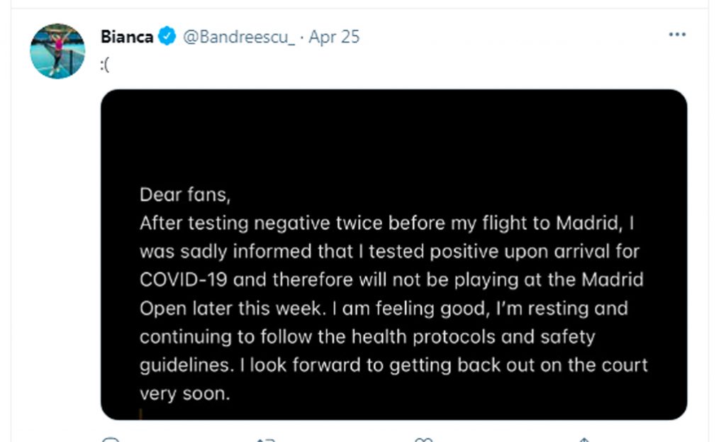 “După doua teste negative inaintea zborului meu spre Madrid, am fost testata pozitiv la Covid-19, din pacate, la sosirea mea, asa ca nu voi putea participa la Openul de la Madrid din aceasta saptamana. Ma odihnesc si urmez in continuare protocoalele sanitare si recomandarile privind siguranta. Sunt nerabdatoare sa revin pe teren cat mai repede”, a precizat Bianca in mesaj postat pe Twitter.