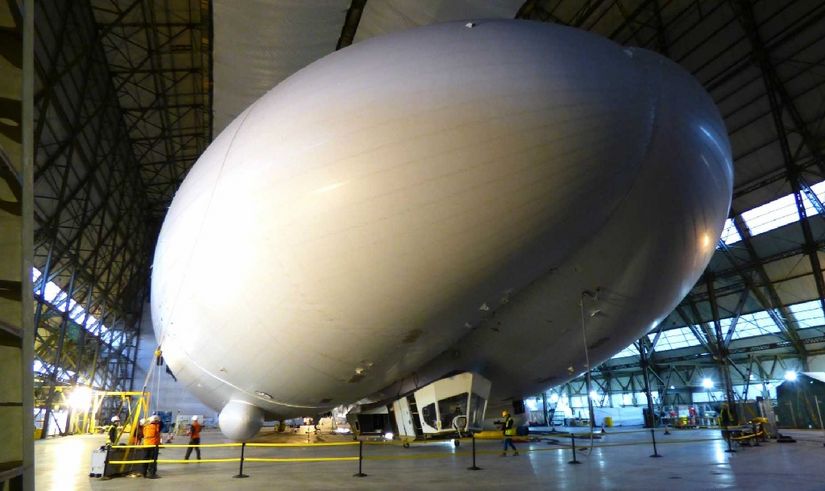 DirijCu 92 de metri lungime – dar si un spatiu interior generos, aeronava construita de Hybrid Air Vehicles a facut pentru fotografii britanici o scurta prezentare intr-un hangar din apropierea Londrei.