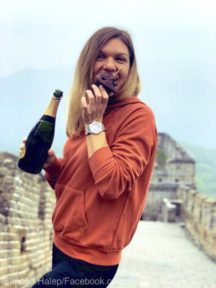 Simona Halep a sarbatorit implinirea a 28 de ani desfacand o sticla de sampanie si savurand o briosa pe Marele Zid Chinezesc – dupa cum se vede in fotografia postata pe contul ei de socializare. Alaturi de Simona se mai afla iubitul sau, antrenorul Dan Dobre si preparatorul fizic Teo Cercel.