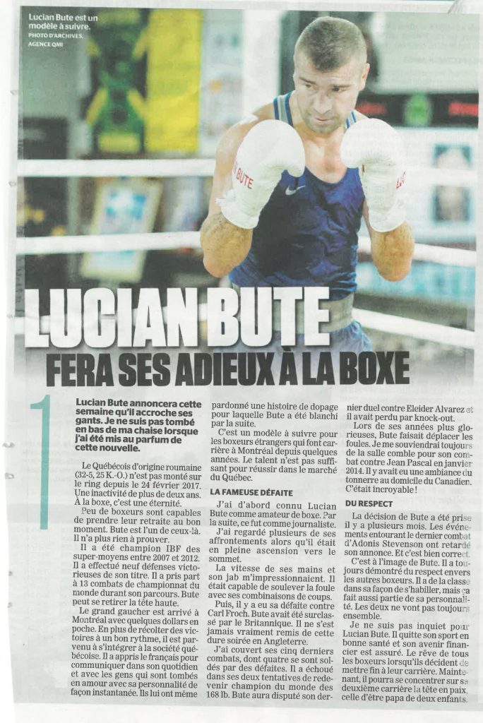 Stirea a fost data de Journal de Montreal, care astazi i-a dedicat un amplu articol boxerului de origine romana al carui plamares numara 32 de victorii – din care 24 prin KO! -, 3 infrangeri si o remiza la profesionisti. De altfel, pe poza ce ilustreaza articolul din publicatia montrealeza sscrie: “Lucian Bute este un model de urmat“.