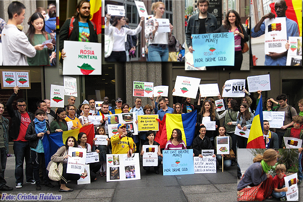 Iar despre despre motivatia de a veni la mitingul de la Montreal si “interesele de grup (in proiectul Rosia Montana -n.r.) care sint sustinute prin deciziile de la Bucuresti”, Cristina Haiducu, una dintre participante, ne-a declarat: “Eu cred ca nu trebuie sa fii specialist in probleme de mediu sau de sanatate ca sa-ti dai seama ce se poate intimpla la Rosia Montana, daca aurul va fi scos pina la urma din pamint cum se vrea acum sa fie scos, e de rau pentru locuitorii zonei si nu numai. E suficient sa ai bunavointa sa te uiti la ce nenorociri s-au intimplat in alte parti ale lumii in urma exploatarilor cu cianura, ca sa nu mai vrei sa repeti ignorant experiente de nerepetat. Experiente atit de nedorite, incit tarile care au trecut prin ele, si unde a existat si vointa politica, au interzis procedura pe teritoriul lor. Dar problema astazi, in cazul celor care decid cum sa se intimple lucrurile la Rosia Montana, nu e lipsa de acces la informatie. Problema lor e alta, daca ma intrebati pe mine, si tine de interesele de grup care sint sustinute prin deciziile de la Bucuresti. Am participat la mitingul de protest de la Montreal pentru ca nu vreau ca oamenii din tara mea sa pateasca ce au patit cei din preajma exploatarilor miniere unde s-a folosit cianura – in Ghana, Statele Unite, Africa de Sud si pe unde a mai fost. Cianura evaporata din lacuri si respirata sau intrata in pinzele freatice si bauta aduce bube, cancer si moarte. Si omoara tot ce e forma de viata in jur, nu numai oameni. Am protestat la miting pentru ca nu ma astept ca decidentii romani sa inteleaga si sa accepte ca ce vor ei nu e bine pentru tara, drept care singura cale e sa li se forteze mina. Doamne ajuta sa reusim! Faptul ca la Rosia Montana ar fi vorba de mai mult decit o exploatare de aur si ca am putea fi inselati si material la afacerea asta poate fi important, dar e secundar pentru mine”.