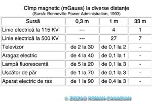 tabel-luluCimpurile electromagnetice din casele canadiene sint in medie de 2 ori mai ridicate decit in SUA si de 10 ori mai mari decit in Europa Ce sint cimpurile electromagnetice din zonele rezidentiale (CEM)? CEM sint linii de forta invizibile generate in jurul aparatelor electrice, a cablurilor de al imentare cu energie electrica, a liniilor de transport si distributie a energiei electrice. Acestea sint generate de existenta unui curent electric (amperaj) si a unei diferente de potential (voltaj), ca de exemplu atunci cind punem in functiune un consumator (cafetiera, uscator, ventilator, veioza etc). Cu cit ne indepartam de sursa de generare a CEM, efectul acestei forte asupra corpului uman scade. Intr-o locuinta, toate persoanele sint expuse zilnic la diverse surse de cimpuri magnetice: frigider, cafetiere, uscator de par, prajitor de piine, calculatoare, cablurile de alimentare cu electricitate, telefoanele mobile, cuptoare cu microunde, aragaz electric, masina de spalat/uscat rufe si multe altele. Principalele surse de emisie de CEM in locuinte Energia electrica produsa in centrale este transportata prin linii de inalta tensiune spre posturile de transformare, unde tensiunea este redusa la 4 sau 34,5 kV.