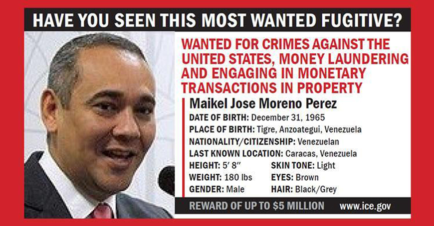 Statele Unite au anuntat o recompensa de 5 milioane dolari pentru orice informatie care va permite arestarea presedintelui Curtii Supreme a Venezuelei, Maikel Moreno Perez, inculpat in luna martie de justitia americana pentru spalare de bani.