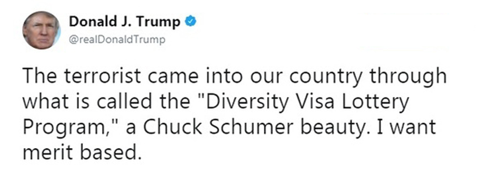 Dupa atentatul din New York, soldat cu 8 persoane ucise si 11 ranite (de catre uzbecul Sayfullo Habibullaevic Saipov, care lucra pentru Uber si care a actionat in numele ISIS), presedintele SUA a anunat ca intentioneaza sa opresca “Programul Loteriei Vizei Diversitatii” si vrea in schimb instituirea unui sistem de acordare a vizelor “‘pe baza de merit”‘.
